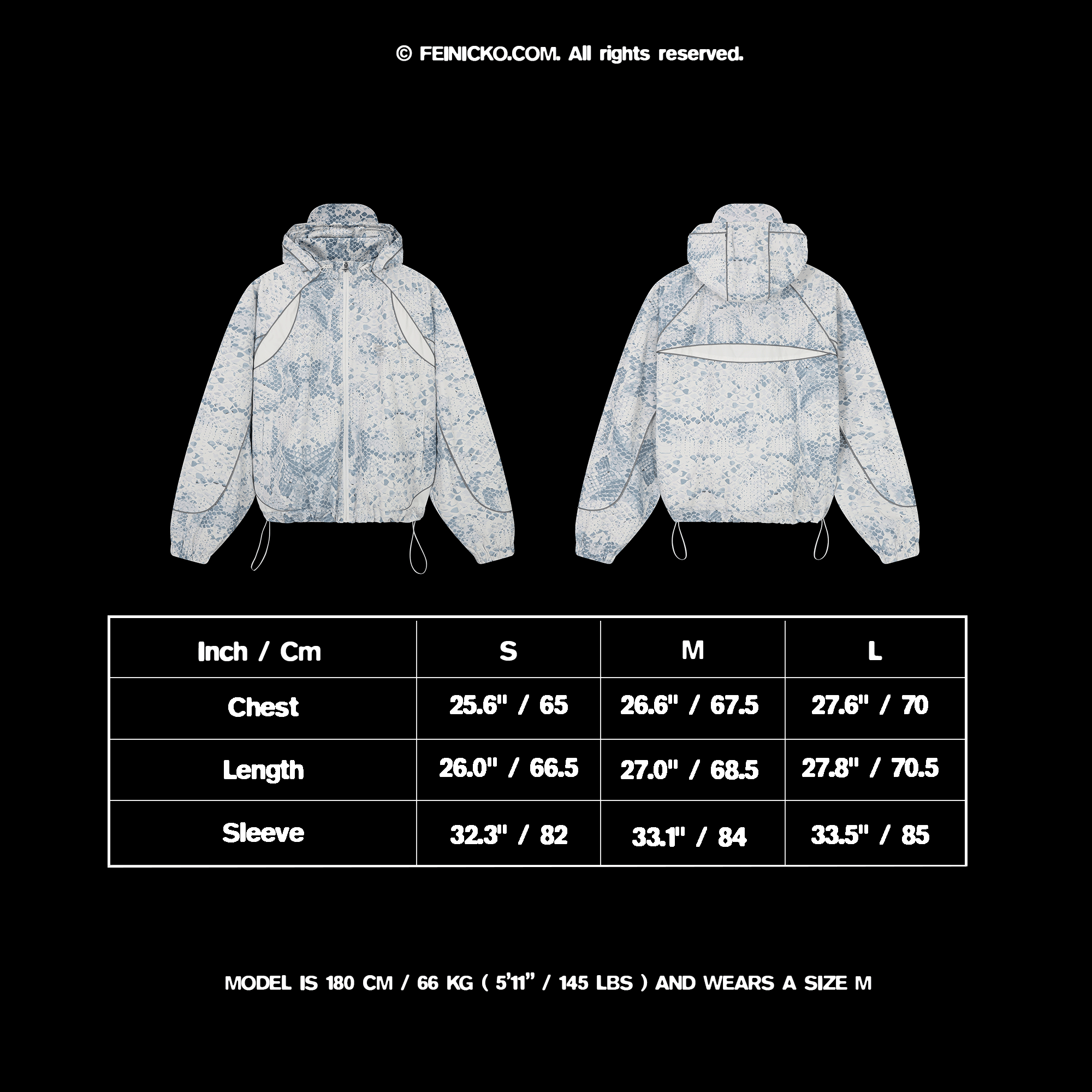 A LIGHTWEIGHT WIND JACKET WITH A RELAXED FIT, FEATURING AN ALL-OVER ALBINO PYTHON DTG PRINT AND REFLECTIVE PIPING THAT FOLLOWS THE JACKET’S SHAPE. MADE FROM A DURABLE POLY–NYLON BLEND FOR EVERYDAY COMFORT AND FUNCTIONALITY.