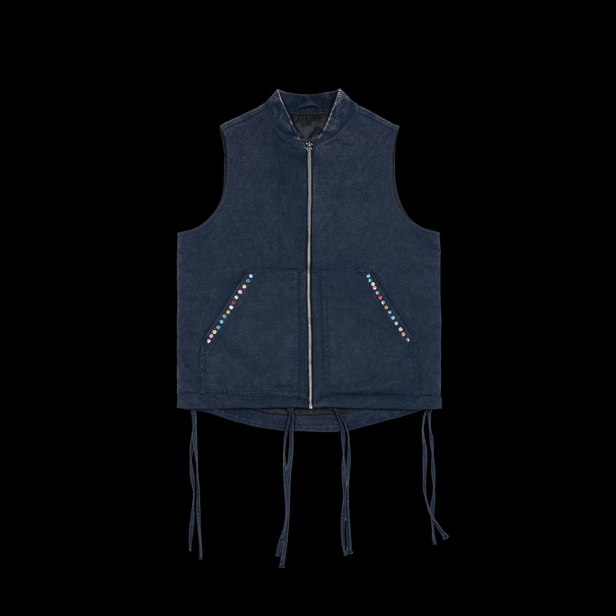 RELAXED FIT ZIP VEST MADE FROM DURABLE 100% COTTON CANVAS, INSPIRED BY CLASSIC WORK VESTS FROM CARHARTT. GARMENT DYED AND STONEWASHED FOR A NATURALLY WORN LOOK. FEATURES COLORFUL GEM DETAILS ALONG THE POCKET EDGES, A SUBTLE FEINICKÖ CHEST EMBOSS, AND A SIGNATURE YKK ZIPPER WITH HORSE-SHAPED PULLER. LIGHT QUILTED LINING PROVIDES COMFORT FOR YEAR-ROUND WEAR.