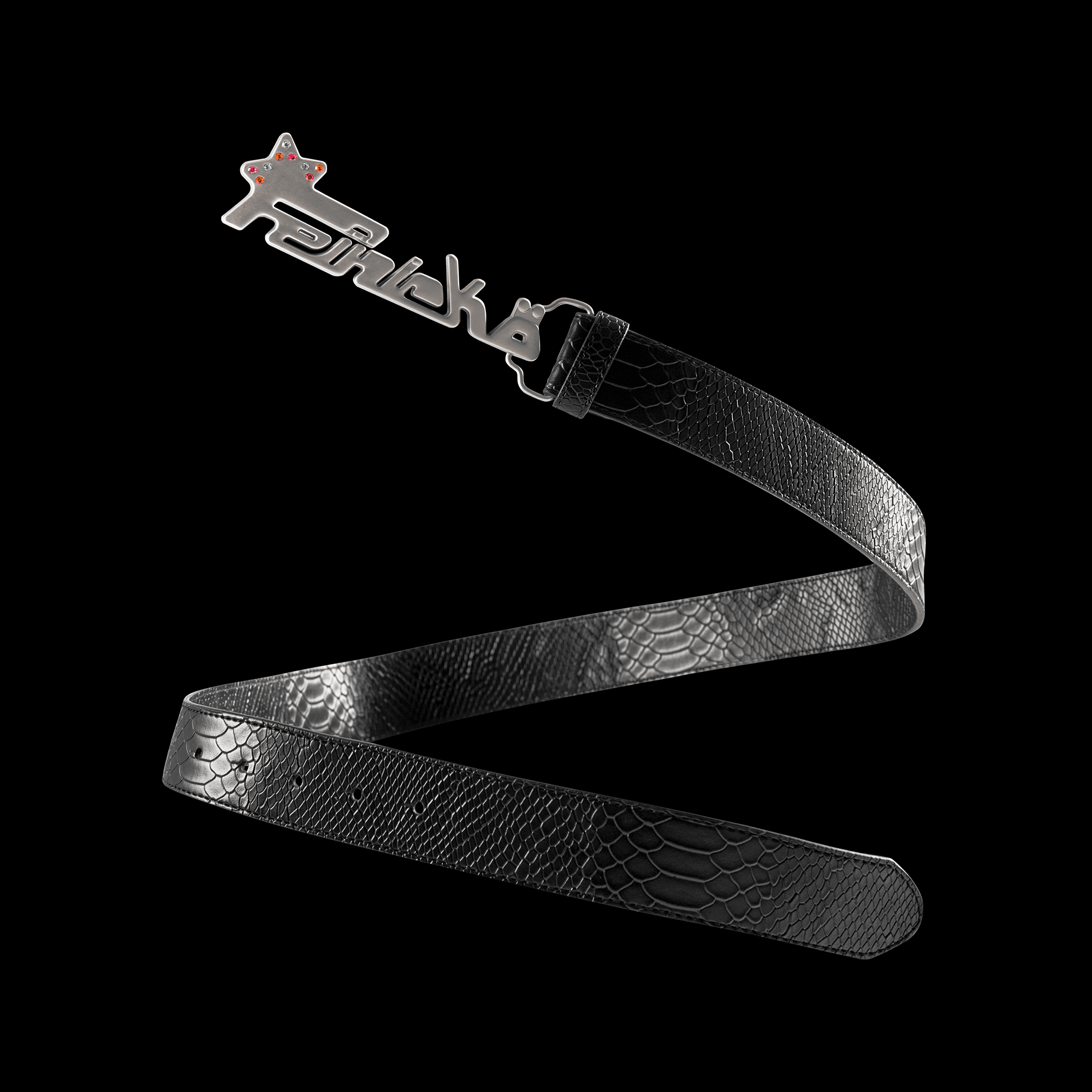 PREMIUM BELT FEATURING A CUSTOM FEINICKÖ LOGO BUCKLE CAST FROM SOLID METAL AND EMBELLISHED WITH MULTICOLOR GEMS. PAIRED WITH A REPTILE-EMBOSSED LEATHER STRAP, DESIGNED TO ADD A DISTINCTIVE STATEMENT TO ANY LOOK.