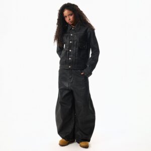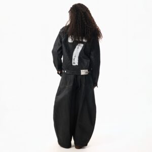 THE DENIM JACKET IS CUT TO A REGULAR RELAXED FIT WITH LONG SLEEVES, MID LENGTH, AND A CLASSIC COLLAR DESIGN. CRAFTED FROM PREMIUM 14OZ COTTON DENIM WITH A SPECIAL COATING TREATMENT THAT PRESERVES STRUCTURE AND ADDS A SUBTLE SHINE. THE LARGE SILK-SCREENED NUMBER 7 ON THE BACK REPRESENTS A TRIPLE MEANING: LUCK, LEGACY, AND LAYERS. CUSTOM LOGO-EMBOSSED BUTTONS AND A HANDMADE LEATHER PATCH ADD AUTHENTIC STREET AESTHETICS AND ARTISAN CRAFTSMANSHIP TO EVERY PIECE.